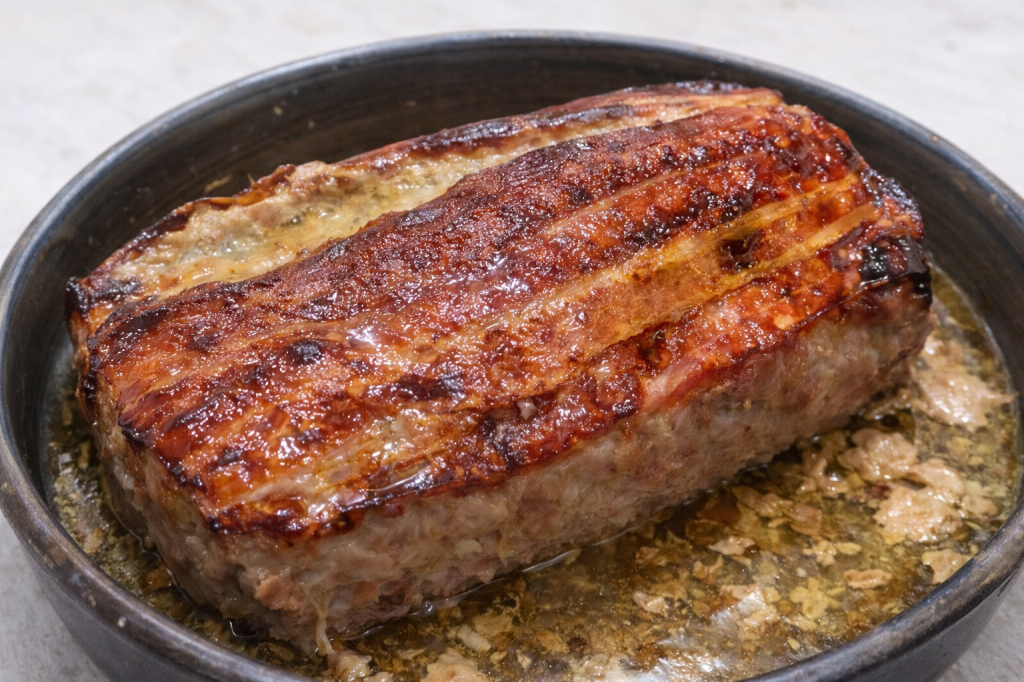 - Chemiser un moule à cake avec le lard petit déjeuner. Le remplir avec le haché préparé. Fermer le dessus avec du lard également.
