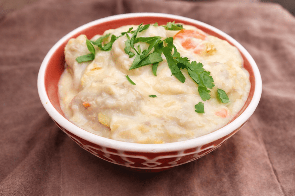 - Dans une cocotte, démarrer comme une béchamel : faire fondre le beurre, ajouter 4 cuillères à soupe de farine. Verser le bouillon et laisser cuire en mélangeant environ 10 minutes. La sauce doit être épaisse.