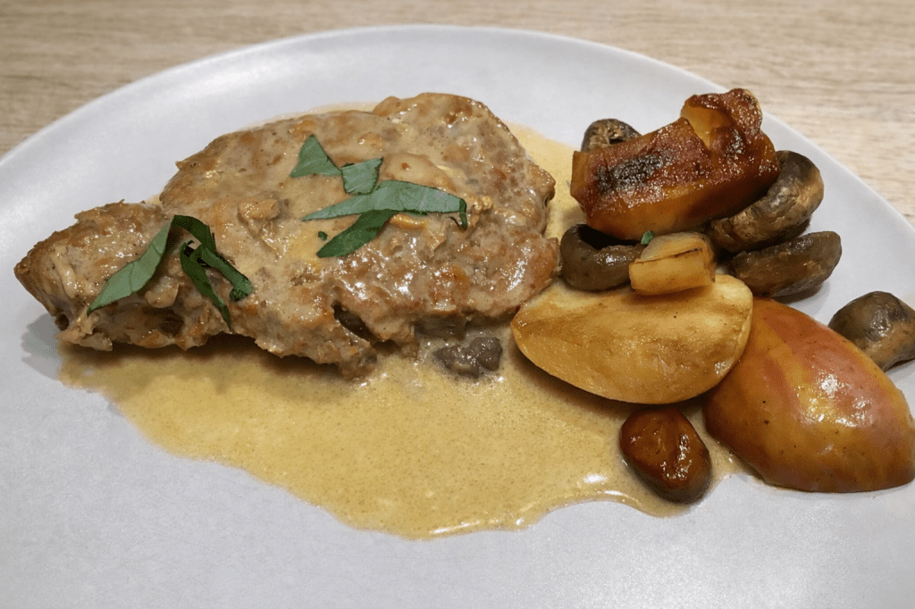Ici, on est plutôt dans une inspiration normande, avec une bonne sauce à la crème épaisse, bien nappante. Les pommes et les champignons sont revenus au beurre et se mélangent très bien à cette sauce.