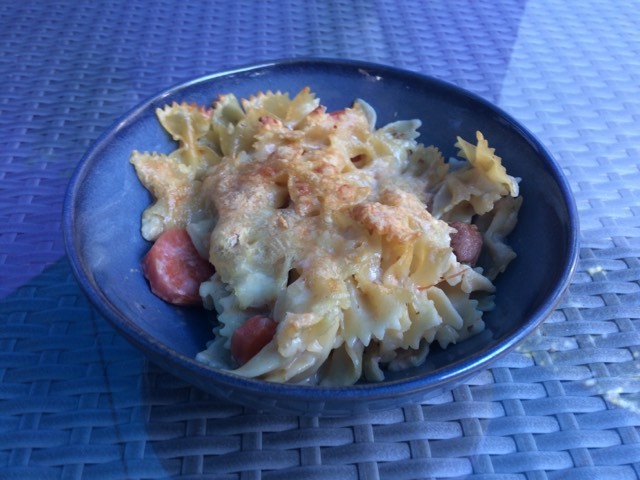 - Cuire les pâtes et les mélanger à la sauce et à la crème. Placer dans un plat allant au four et surmonter du Munster en tranches.