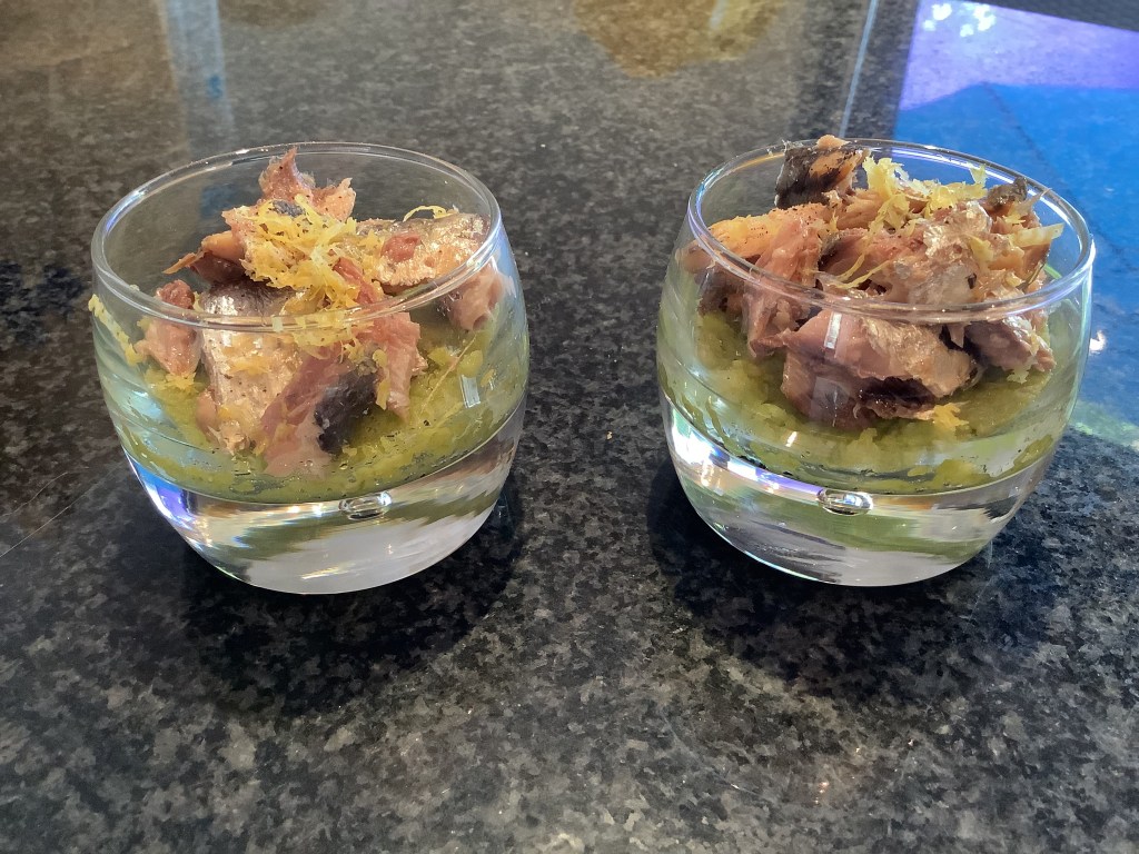 - Verser ce mélange dans les verrines. Surmonter des sardines égouttées et taillées en gros morceaux. Terminer avec le zeste du citron.