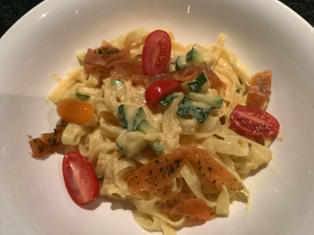 Des pâtes au saumon onctueuses … mais avec un tas de légumes. Tout de suite ça égaye !