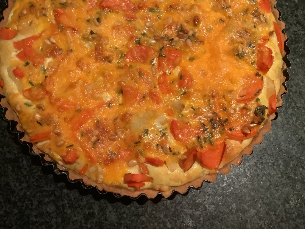 - Réaliser l’appareil en mélangeant : les œufs, la crème, sel et poivre, le cumin, la ciboulette, le cheddar et les pignons.