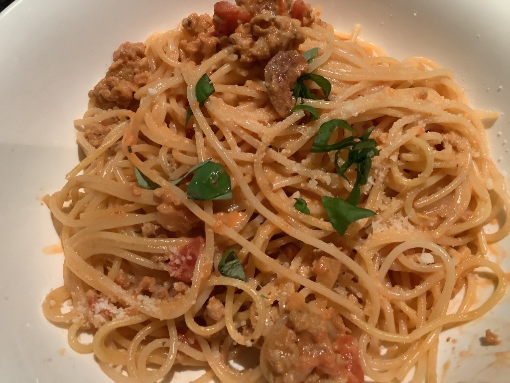 - Égoutter les pâtes et les verser dans la cocotte de sauce. Bien les napper. Servir avec du parmesan râpé et de basilic émincé.