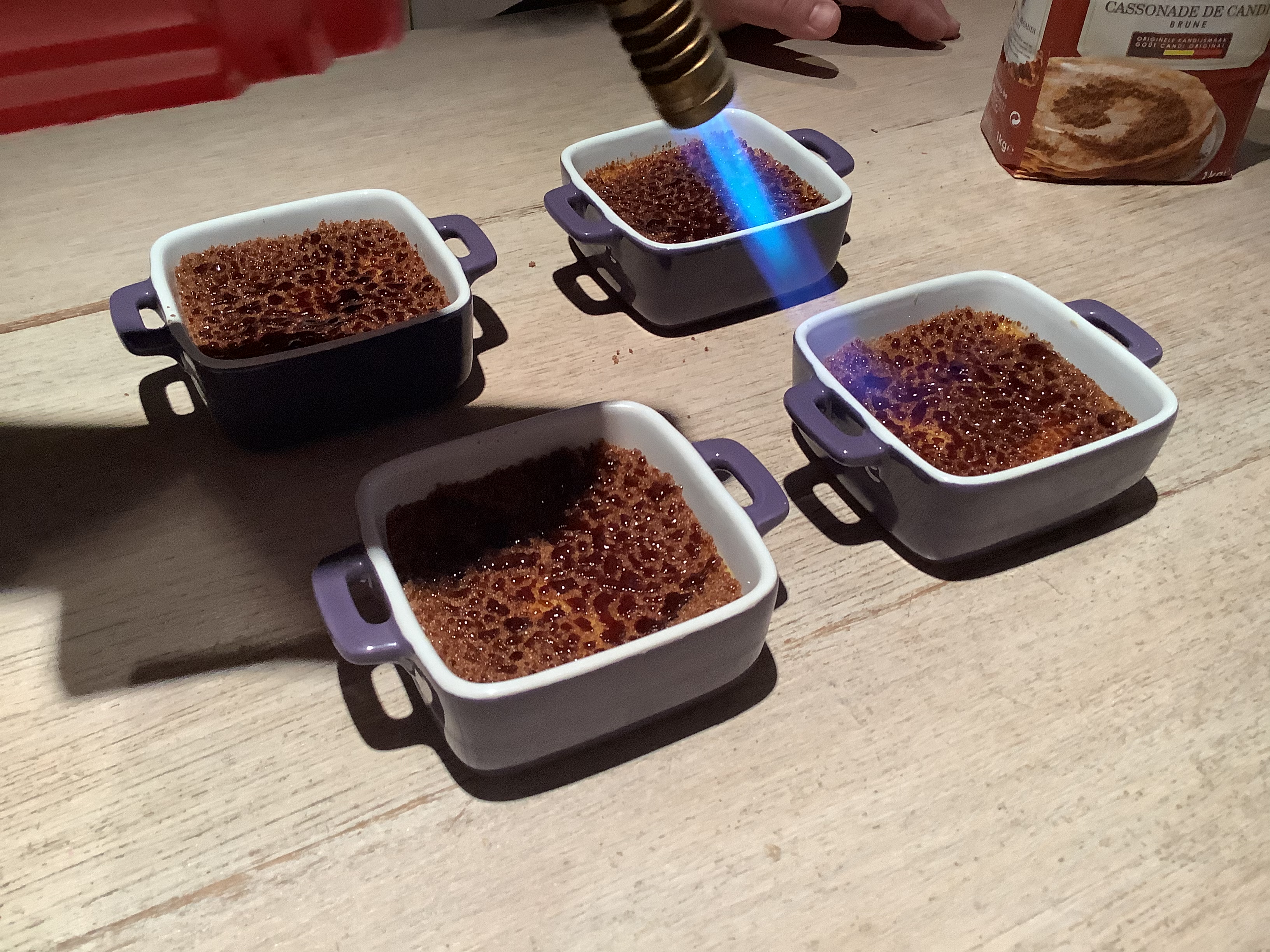 Au moment de servir, saupoudrer de sucre ou de cassonade et griller au chalumeau de cuisine. Servir de suite.