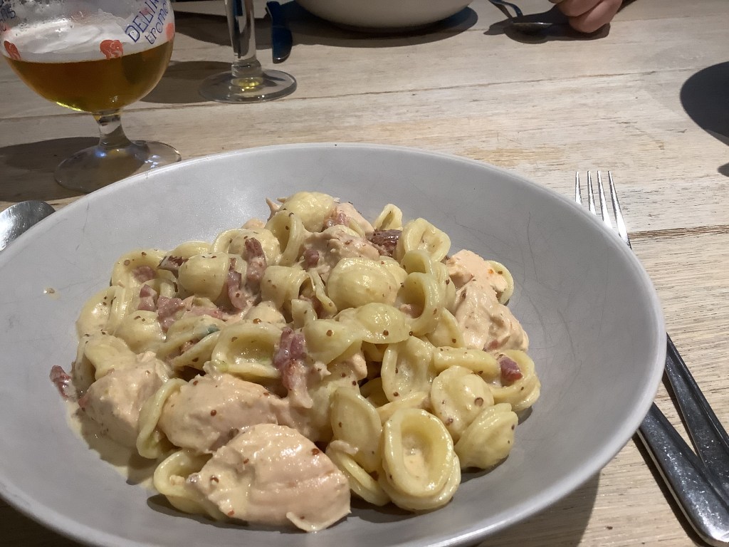 Si comme moi vous avez un homme qui vous dit « encore des pâtes ! » : laissez les blancs de poulet entiers. Le visuel sera plus classique.