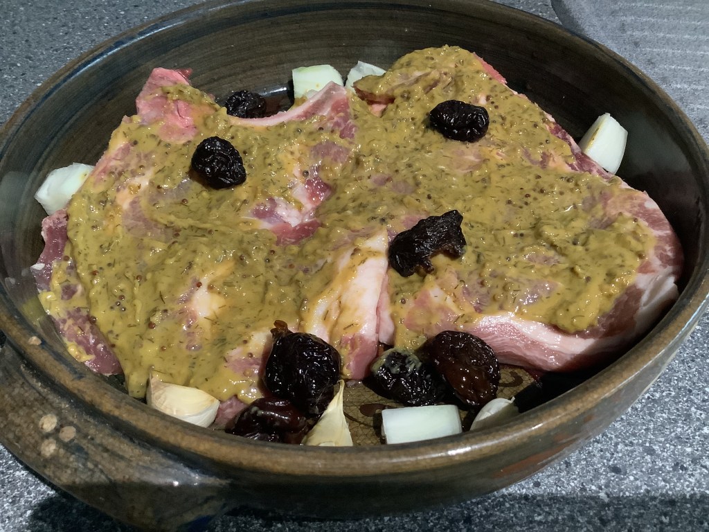 Les badigeonner d’un mélange moutarde/aneth. Saler. - Disposer autour de la viande : l’oignon grossièrement coupé et les gousses d’ail non pelée.