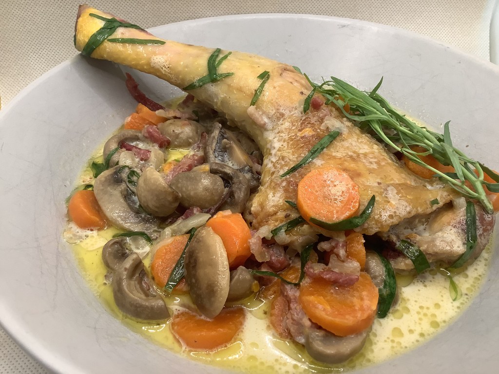 - Terminer la sauce au moment de manger : ajouter la crème. Laisser épaissir deux minutes. Terminer avec les feuilles d’estragon. Servir avec des frites.