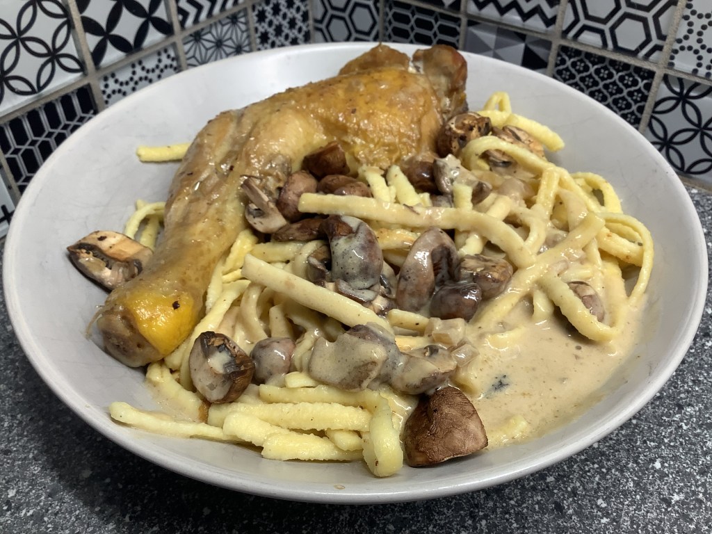 - Cuire les spaetzle en parallèle dans de l’eau salée et les garder égouttées dans la passoire, ( les miennes demandaient 18 minutes de cuisson). Un peu avant de manger, les rissoler à feu vif dans du beurre pour les roussir un peu si possible.