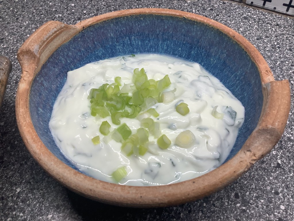 - Préparer la sauce en mélangeant le yaourt, l’oignon nouveau détaillés en petites rondelles, l’ail finement émincé ( au presse ail), le persil émincé. Saler, poivrer. Garder au frais.
