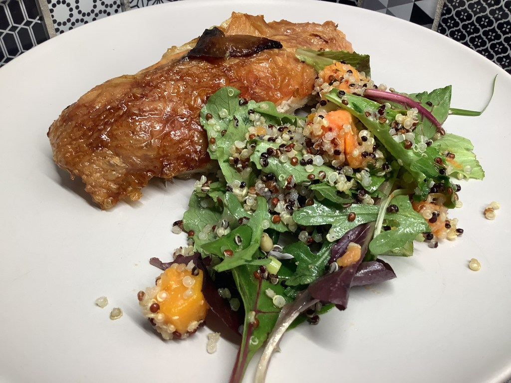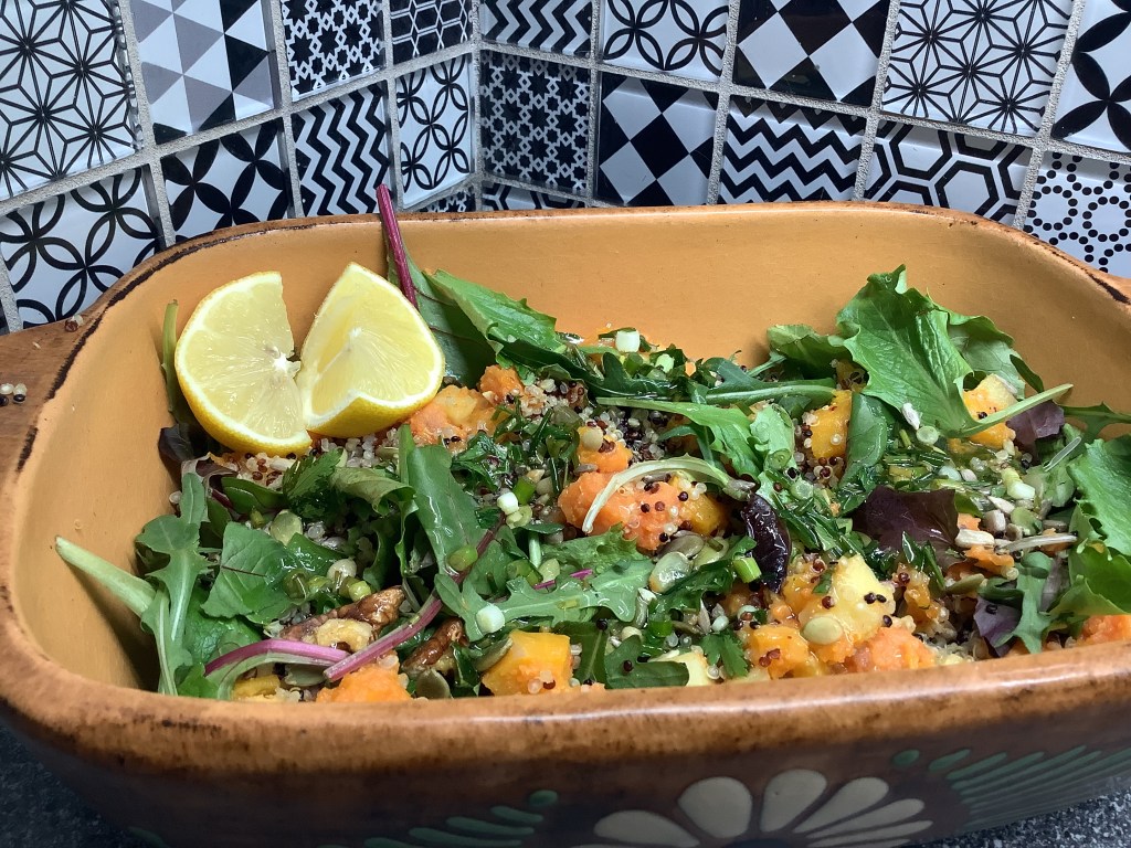 - Dresser au moment de manger : la laitue en dessous, le quinoa, puis les légumes. Arroser avec la vinaigrette. J’ai servi à température ambiante, avec un poulet rôti ( coucou de Malines).