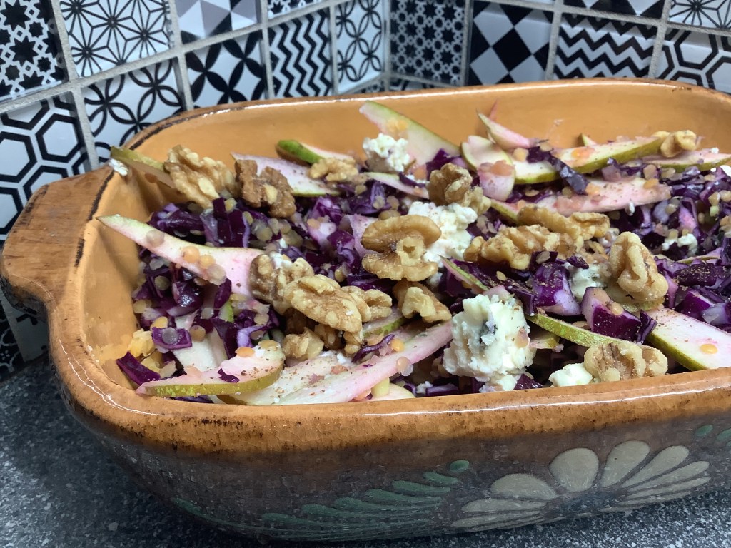 - Dresser le chou, les lentilles, l’oignon nouveau, le Roquefort en cubes et les noix. Verser la vinaigrette au moment de servir. J’ai accompagné cette salade de saucisses grillées.