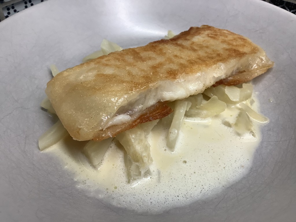 - Terminer la sauce : récupérer le fenouil et le garder au chaud. Émulsionner – au mixeur – le jus avec deux cuillères de beurre. Rectifier l’assaisonnement.
