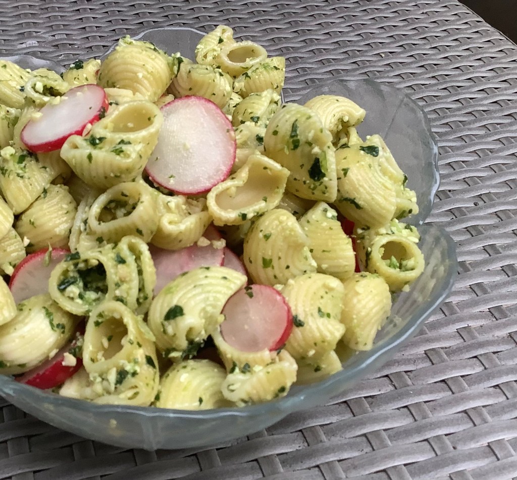 - Mixer ensemble les noix de cajou, les fanes de radis, l’ail des ours, l’huile d’olive, sel et poivre. Ajouter une louche d’eau de cuisson des pâtes.