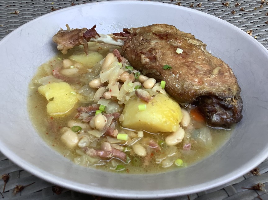 Ajouter les haricots cuits et les cuisses de canard confit entières ou coupées. Laisser mijoter encore 30 à 40 minutes, à découvert en fin de cuisson pour concentrer les saveurs.