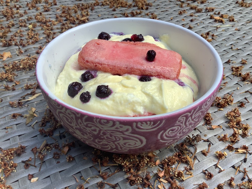 - Dans le plat de service, déposer d’abord une couche de cette crème. Alterner les étages avec des biscuits trempés dans le coulis de framboise ( délayé avec un peu d’eau).