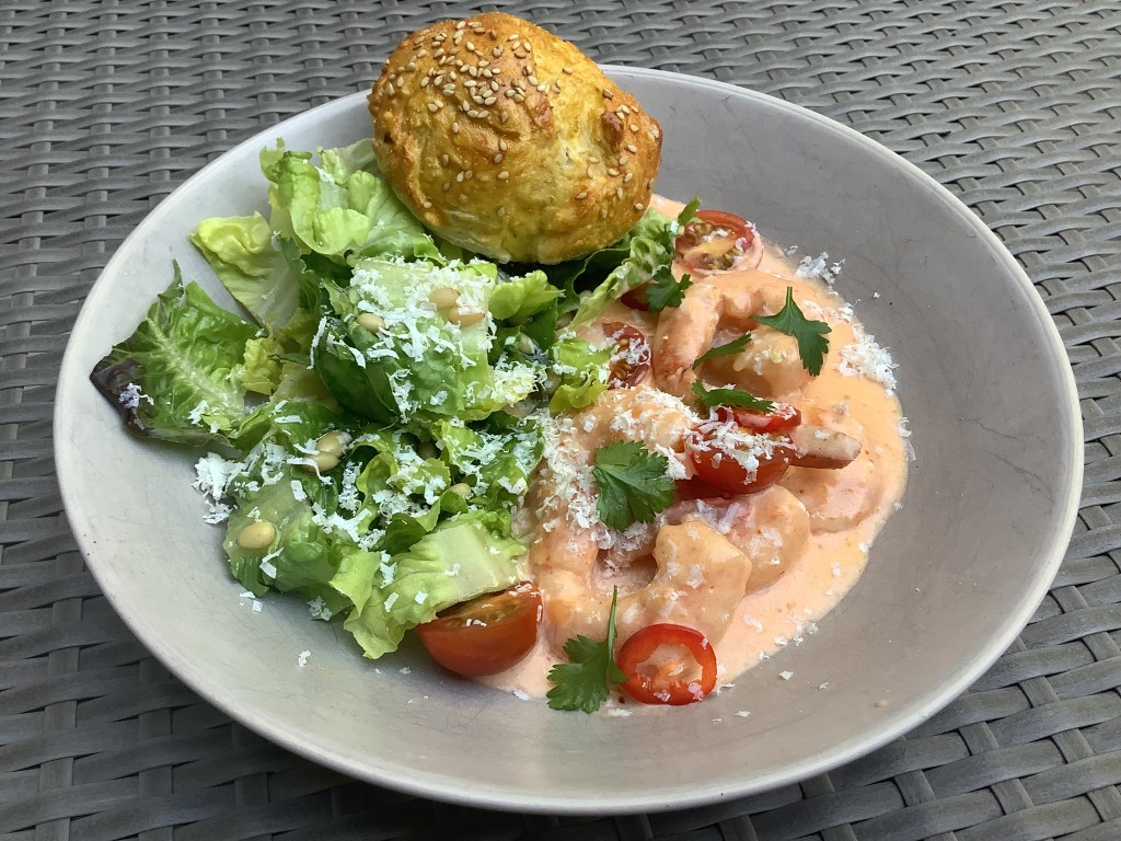 - Dans la même poêle : déglacer avec le vin blanc, ajouter la crème, le pili pili, sel et poivre, le concentré de tomates. Laisser cuire quelques minutes. Remettre les scampis juste pour les réchauffer.
