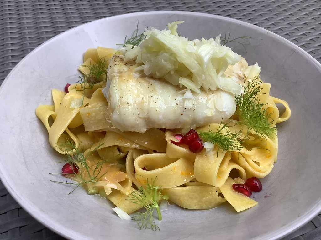 - Dressage : un nid de tagliatelles, poser dessus le poisson. Verser un peu de sauce. Surmonter du fenouil émincé. Décorer avec les pluches de fenouil, la grenade et un tour de poivre du moulin.