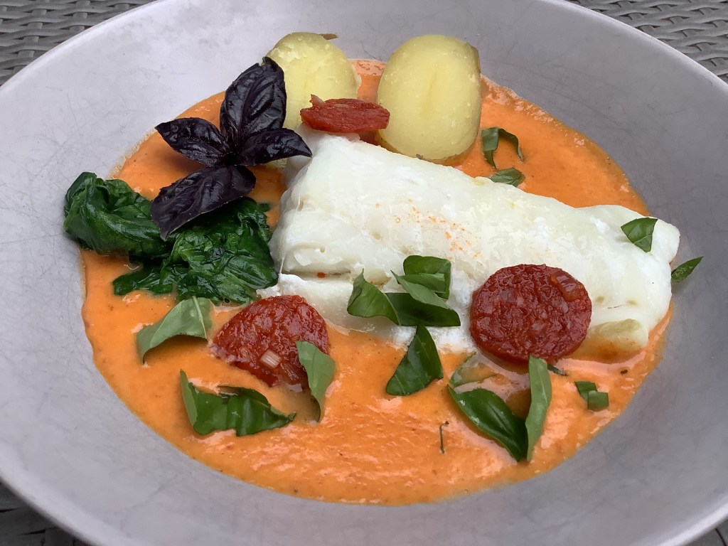 - Préparer la sauce : faire rissoler le chorizo pelé et coupé en rondelles, avec l’échalote émincée. Quand il colore, garder quelques tranches pour la déco. Déglacer avec le fond de poisson. Laisser mijoter 10 minutes. Mixer et finir la sauce avec la crème. Refaire chauffer pour tout bien mêler.