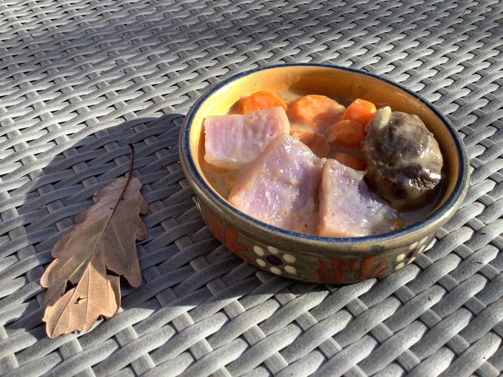- 1/2 heure avant la fin de la cuisson, intégrer les pommes de terre pelées. Ajouter un peu d’eau si nécessaire. Laisser cuire jusqu’à cuisson des pommes de terre et pour obtenir une belle sauce nappante.