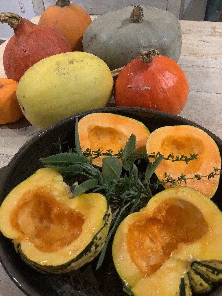- Placer les courges dans un plat allant au four, avec les herbes. Saler et verser un filet d’huile d’olive