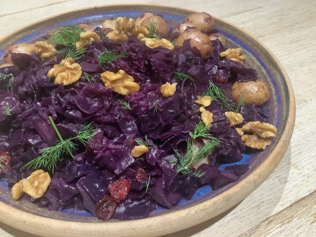 Le chou doit être tendre. Rectifier l’assaisonnement. - Servir décoré avec les noix, le reste d’aneth émincé et un blanc de poulet grillé.