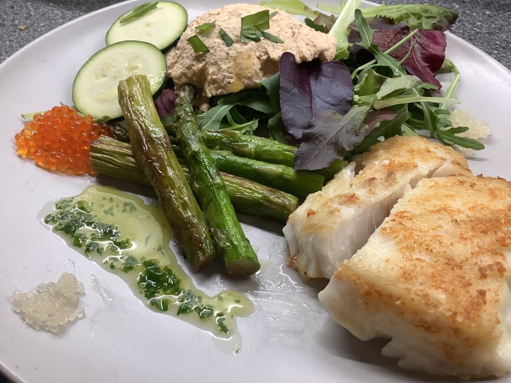 Je suis partie en ville avec une idée en tête : m’inspirer d’une assiette de chef, mais en version maison, avec ce que je trouverais chez mes commerçants à Liège. Passage chez le légumier pour de belles asperges de Malines, puis chez le poissonnier… où j’ai opté pour un dos de cabillaud, parfait pour éviter les arêtes et plaire à tout le monde.