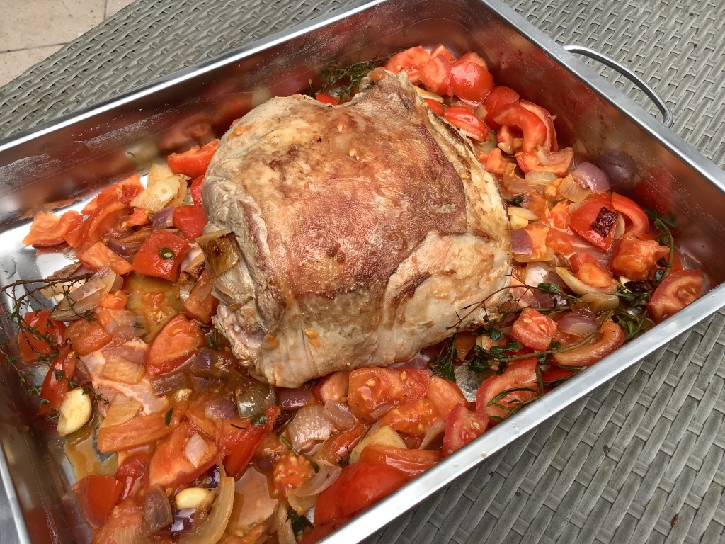 - Je place tous les éléments sur une plaque de cuisson à hauts bords. ( style « lèche frites »), en disposant les tranches de lard en dessous de tout. Et on enfourne 7 heures. Arroser de temps en temps.