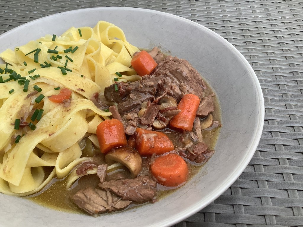 Je m’attaque à une monument aujourd’hui ! Le boeuf bourguignon traditionnel. Me voilà un peu perdue dans mes références de cuisine liégeoise, qui allie plus le sucré-salé et les grosses sauces épaisses.