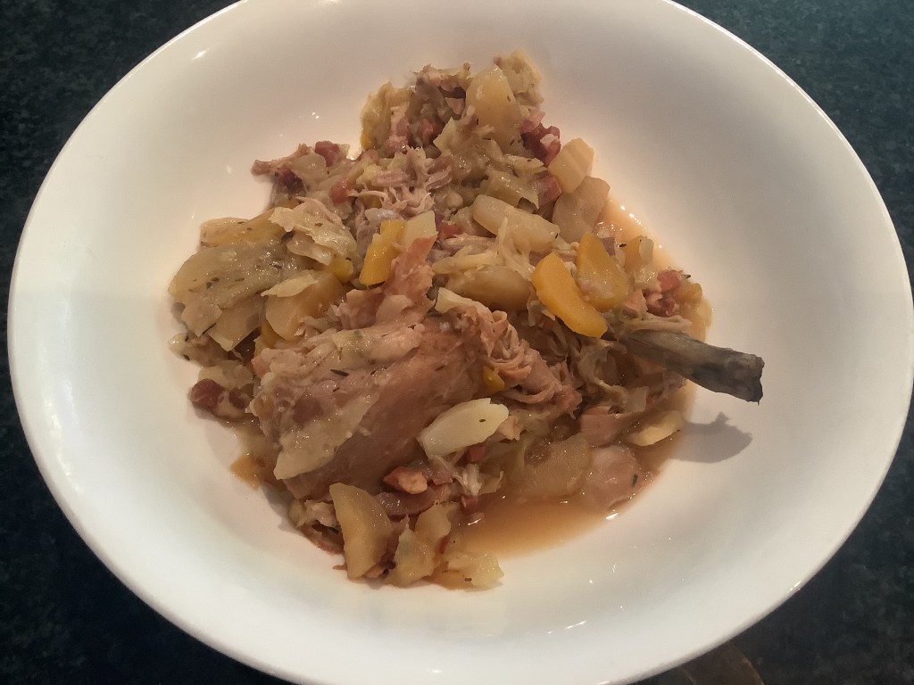 - Tout remettre dans la cocotte en mélangeant un peu. Couvrir et enfourner une heure. Ciseler la ciboulette au dessus du plat. C’est prêt.
