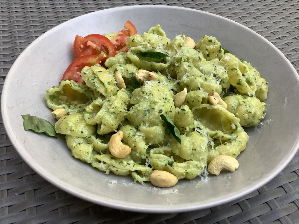 - gros macaronis longs, quelques feuilles de basilic et pécorino à râper pour servir